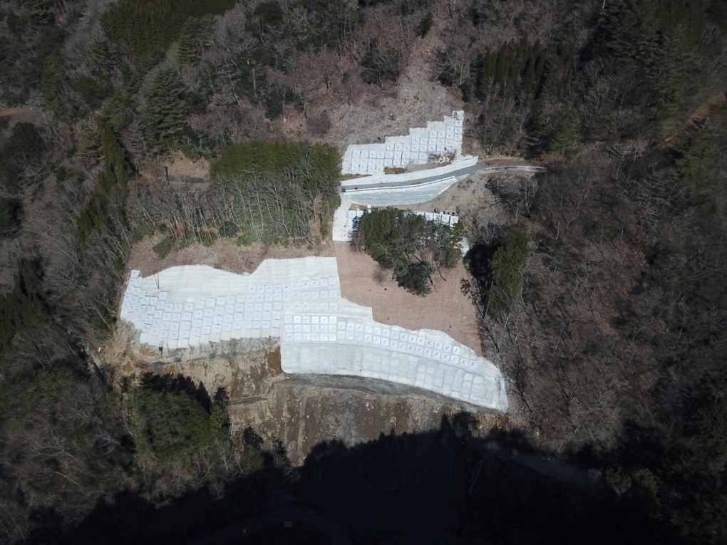 | 工事概要 | 地滑り災害復旧 高所法面掘削機(RCM03)切り崩し117㎥・整形343㎥ 吹付工161㎡ グランドアンカー工38本 軽量剛性受圧板設置38基 |